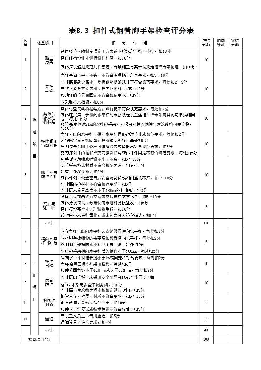 表格名称:表B.3 扣件式钢管脚手架检查评分表