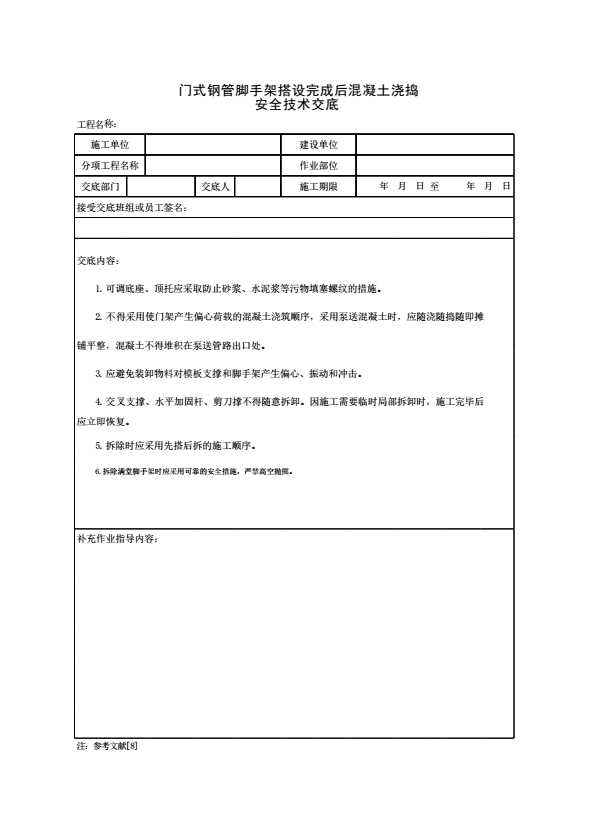 表格名称:门式钢管脚手架搭设完成后混凝土浇捣安全技术交底