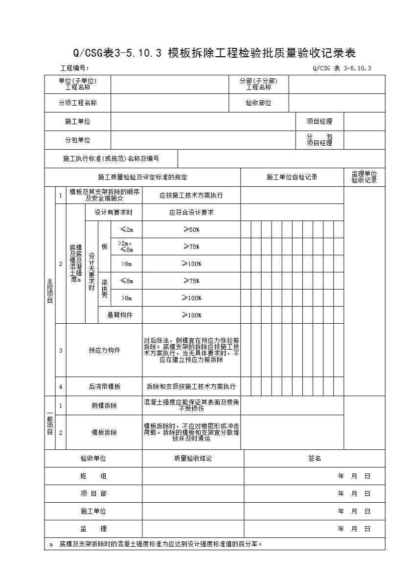 QCSG 表 3-6.6.2 模板拆除工程检验批质量验收记录表