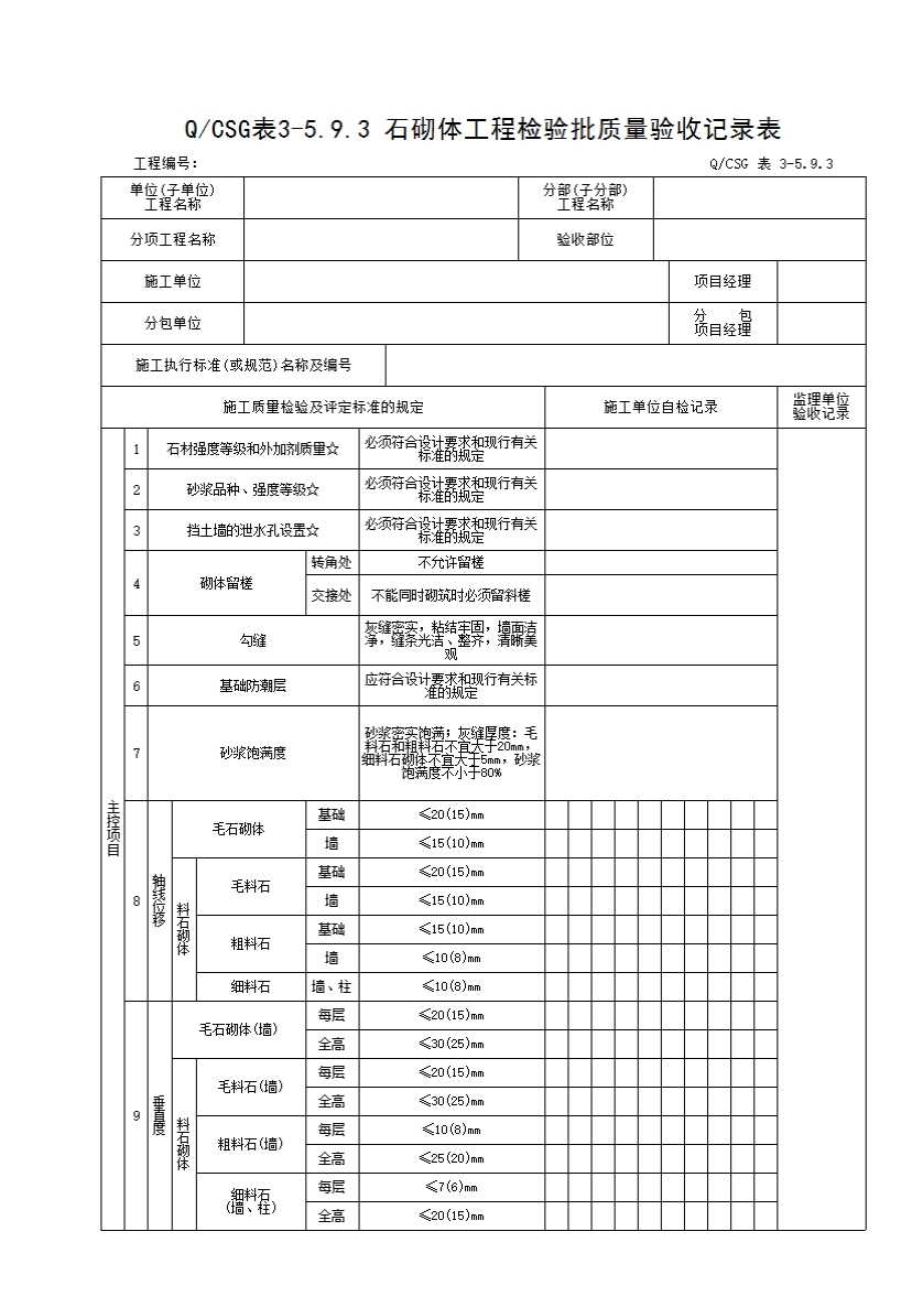 QCSG 表 3-10.3.4 石砌体工程验批质量验收记录表