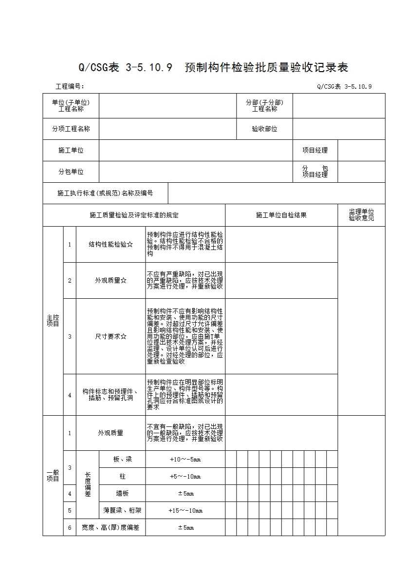 QCSG 表 3-5.10.9 预制构件检验批质量验收记录表