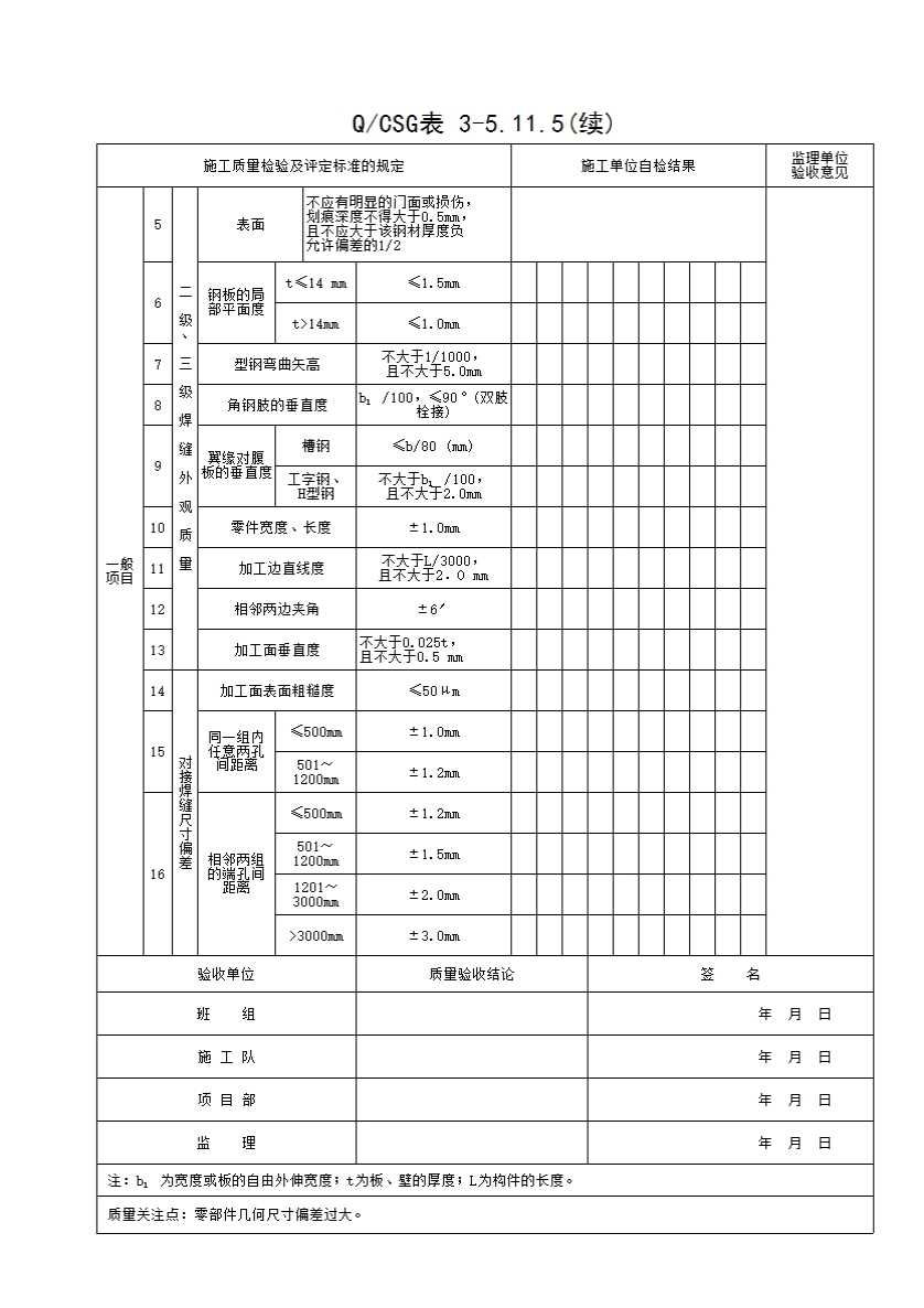 表格名称:QCSG 表 3-5.11.5 钢结构零、部件加工工程检验批质量验收记录表