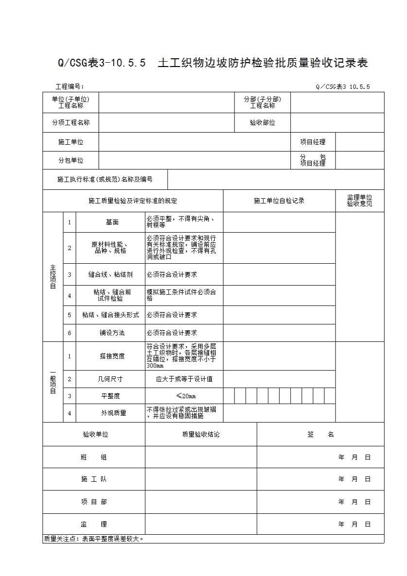 QCSG 表 3-10.5.5 土工织物边坡防护检验批质量验收记录表