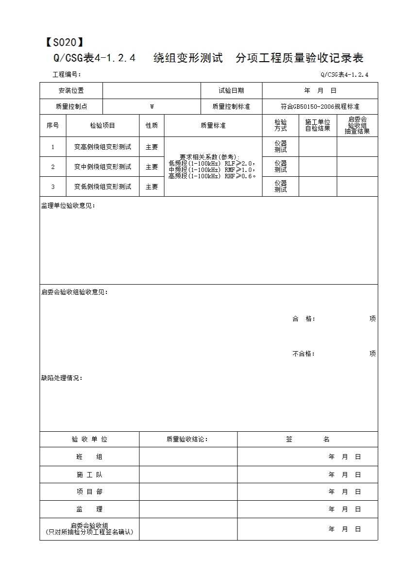 表格名称:QCSG 表 4-1.2.4 绕组变形测试 分项工程质量验收记录表