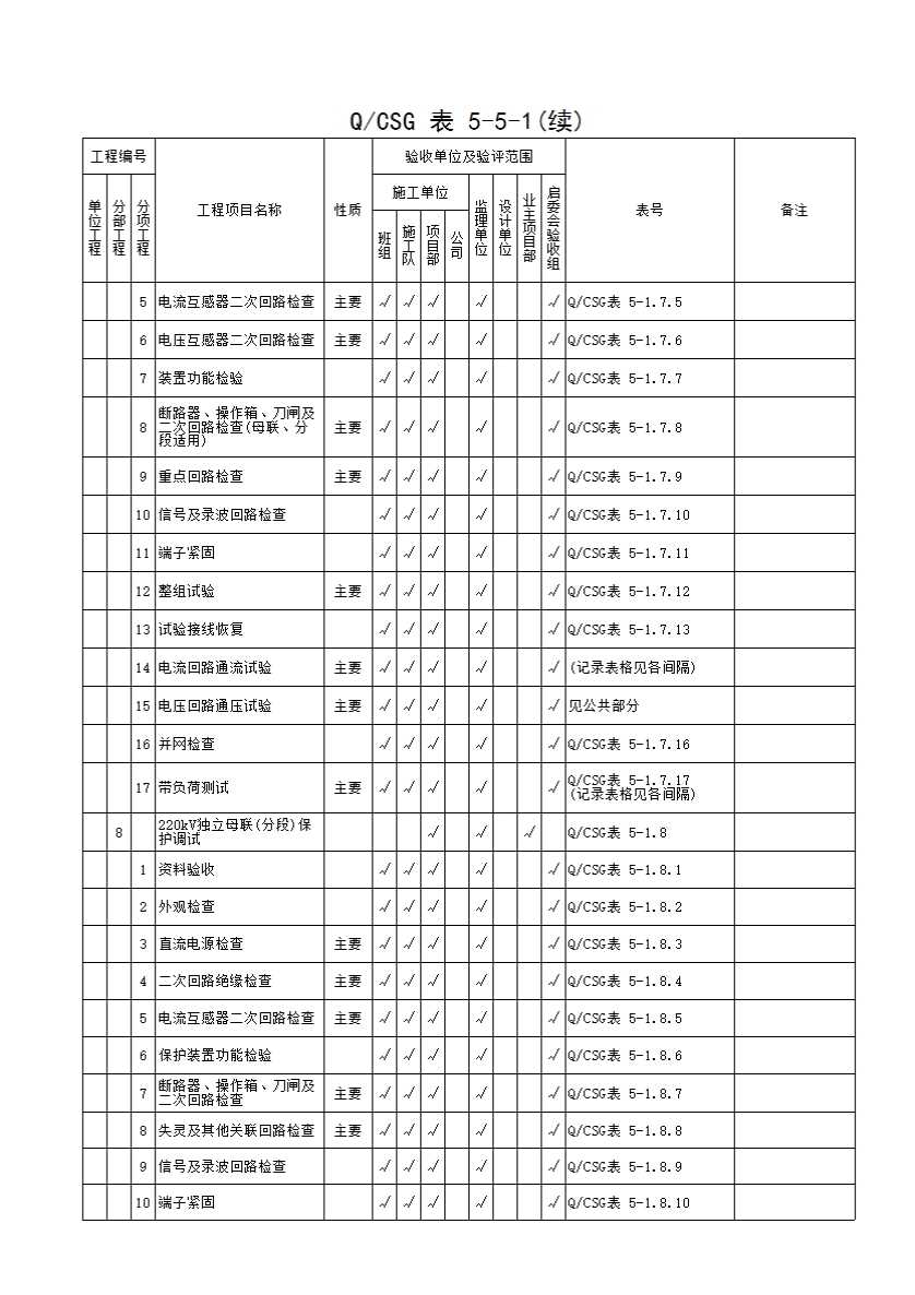 QCSG 表 5-5-1 变电继电保护调试工程质量验收评定范围划分