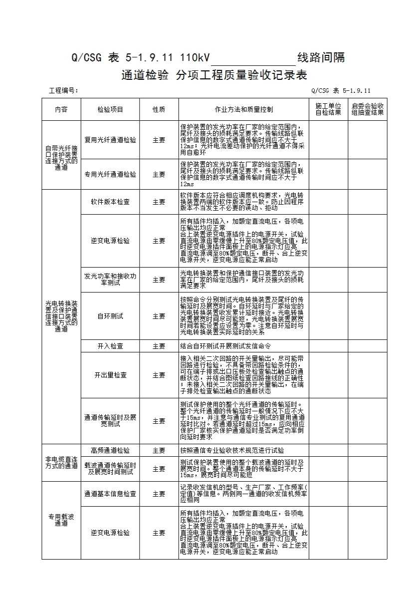 QCSG 表 5-1.9.11 110kV______线路间隔通道检验 分项工程质量验收记录表
