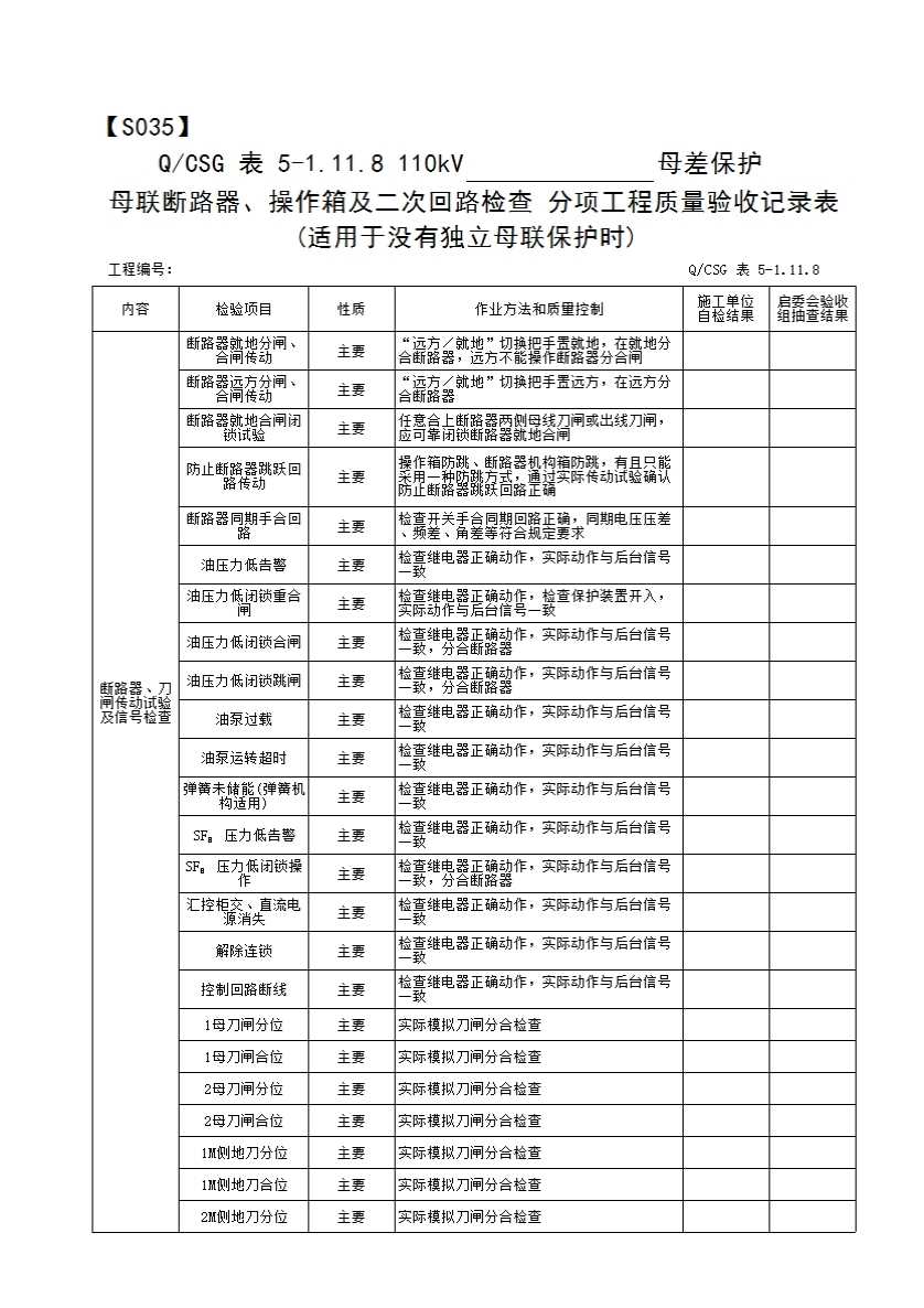 QCSG 表 5-1.11.8 110kV______母差保护母联断路器、操作箱及二次回路 分项工程质量验收记录表(适用于没有独立母联保护时)
