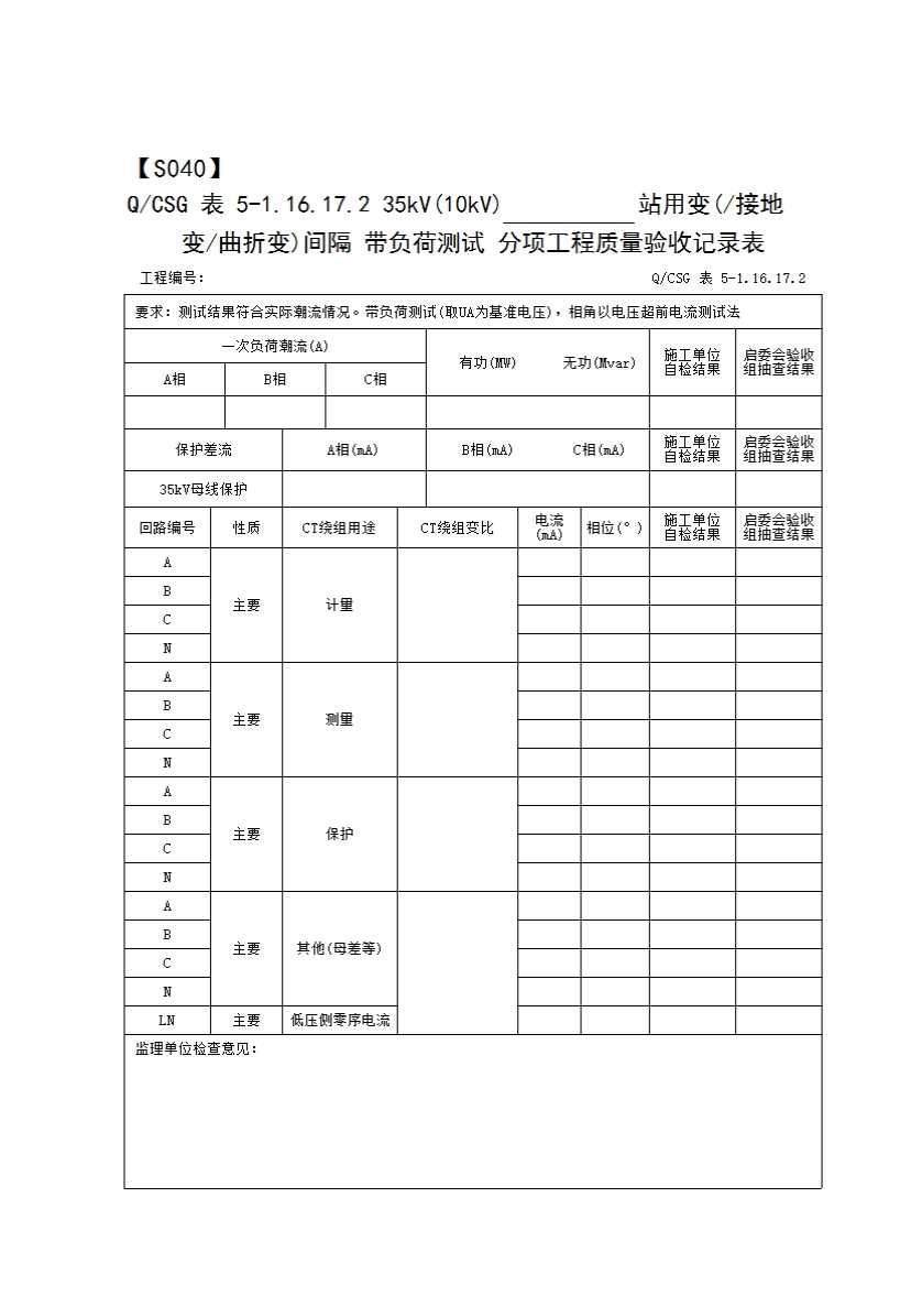 表格名称:QCSG 表 5-1.16.17.2 35kV(10kV)______站用变(接地变曲折变)间隔带负荷测试 分项工程质量验收记录表