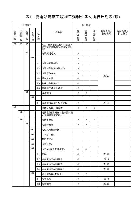 表格名称:表1 变电站建筑工程施工强制性条文执行计划表