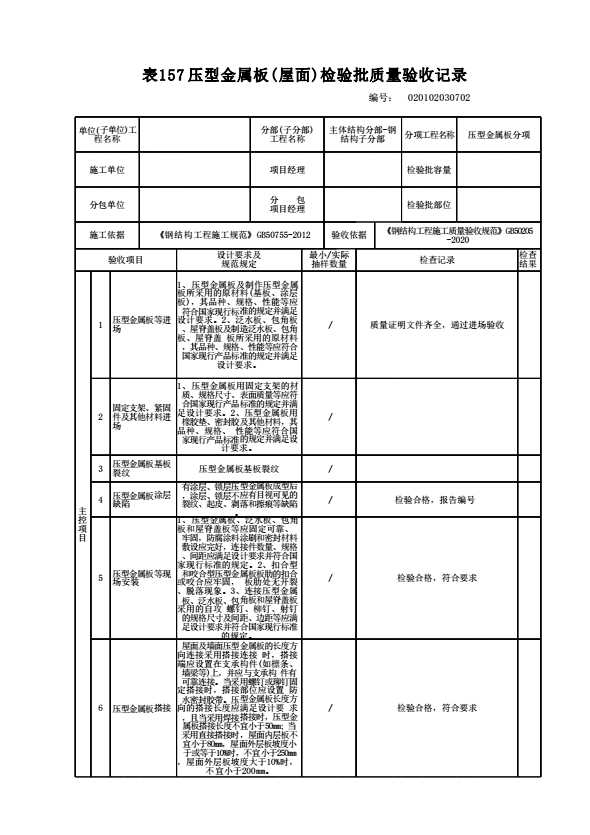 020102030702 压型金属板(屋面)检验批质量验收记录