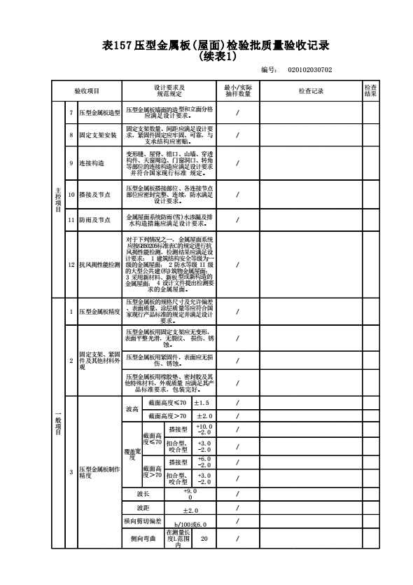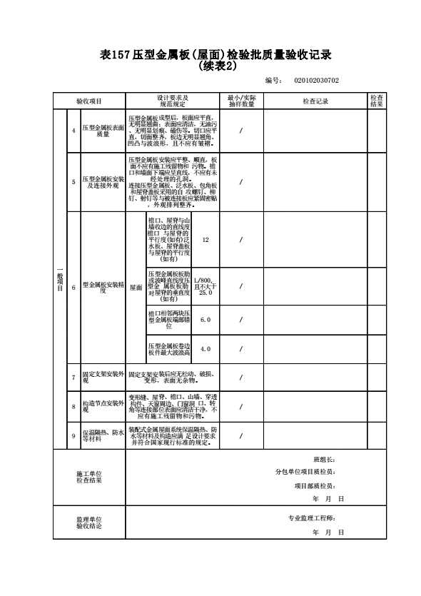 表格名称:020102030702 压型金属板(屋面)检验批质量验收记录