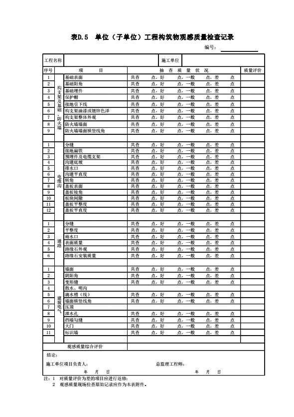 表D.5 单位(子单位)工程构筑物观感质量检查记录