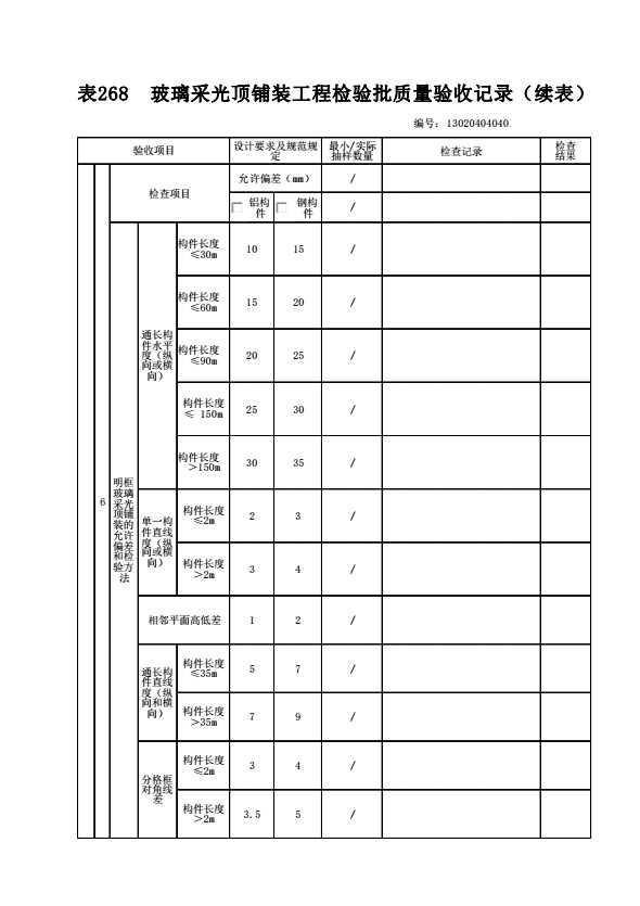 表格名称:130204040401 玻璃采光顶铺装工程检验批质量验收记录