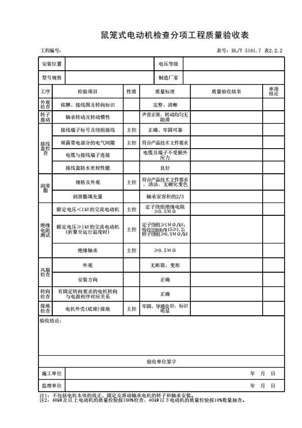 表格名称:表2.2.2 鼠笼式电动机检查分项工程质量验收表