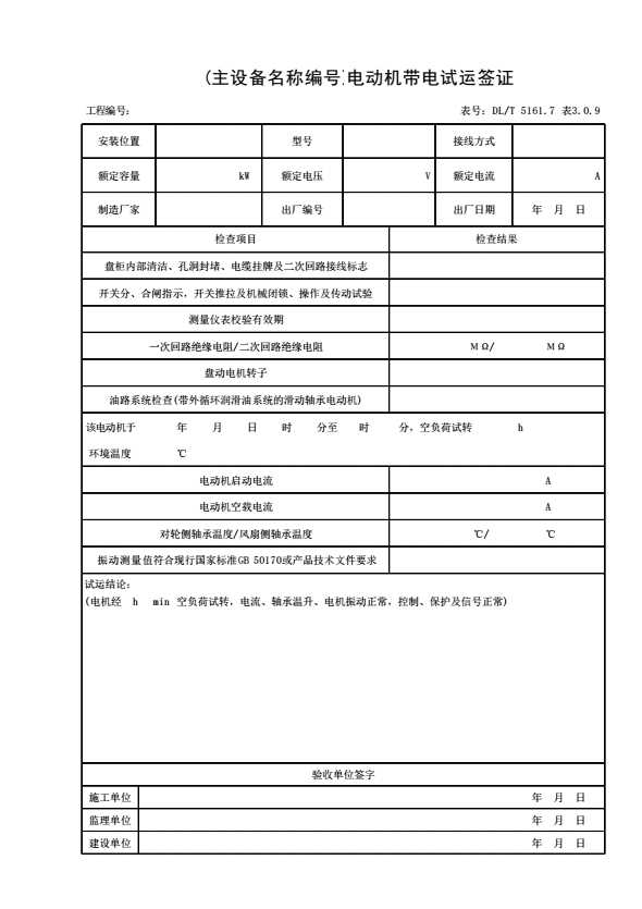 表3.0.9 (主设备名称编号)电动机带电试运签证