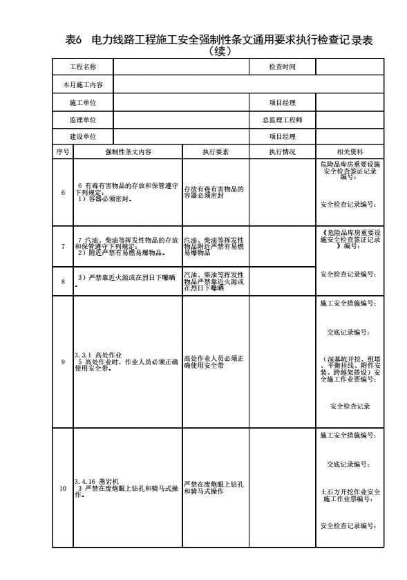 表格名称:表6 电力线路工程施工安全强制性条文通用要求执行检查记录表