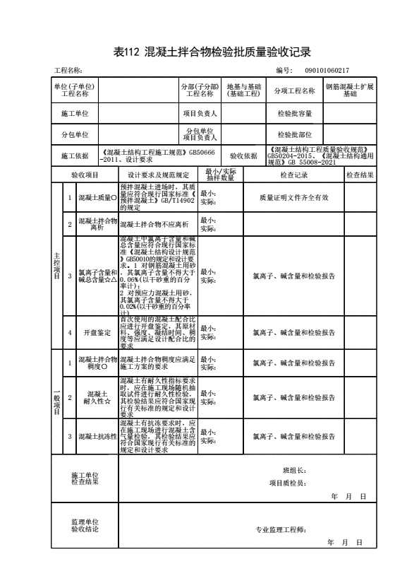 表格名称:090101060217 混凝土拌合物检验批质量验收记录