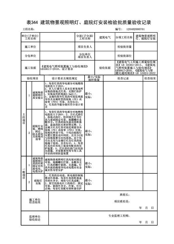 表格名称:120402000701 建筑物景观照明灯、庭院灯安装检验批质量验收记录