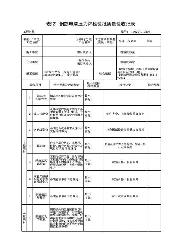表格名称:130204010206 钢筋电渣压力焊检验批质量验收记录