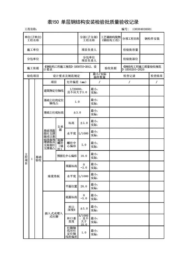 表格名称:130304030601 单层钢结构安装检验批质量验收记录