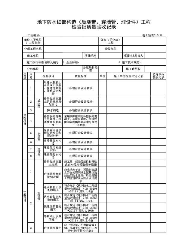 表格名称:电土验表5.5.8 地下防水细部构造(后浇带、穿墙管、埋设件)工程检验批质量验收记录
