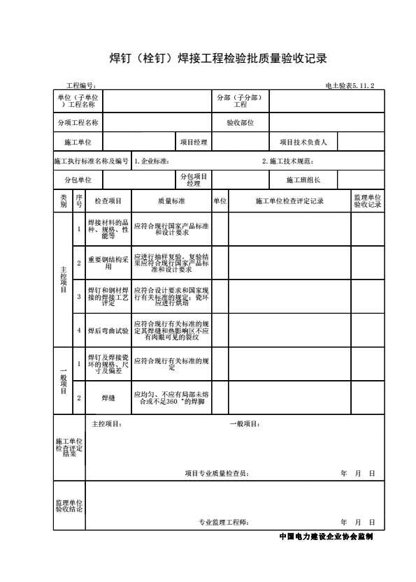 表格名称:电土验表5.11.2 焊钉(栓钉)焊接工程检验批质量验收记录