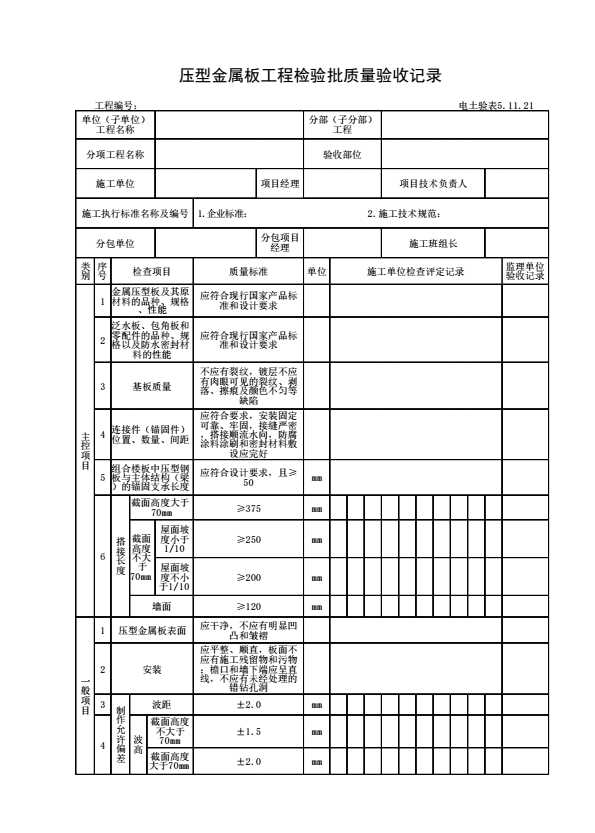 表格名称:电土验表5.11.21 压型金属板工程检验批质量验收记录