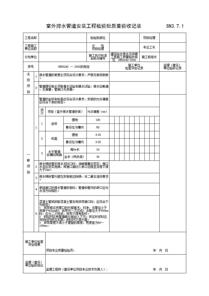 表格名称:SN3_7_1_ 室外排水管道安装工程检验批质量验收记录