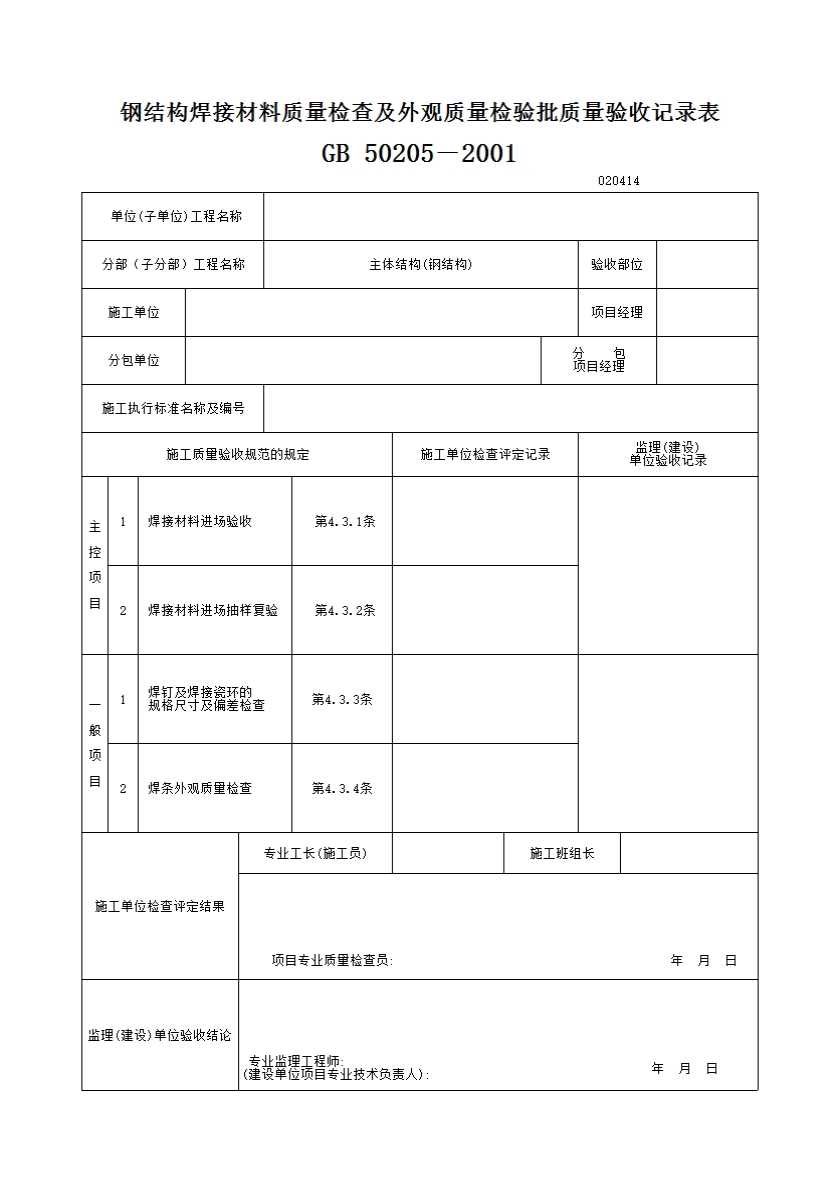 表格名称:钢结构焊接材料质量检查及外观质量检验批质量验收记录表
