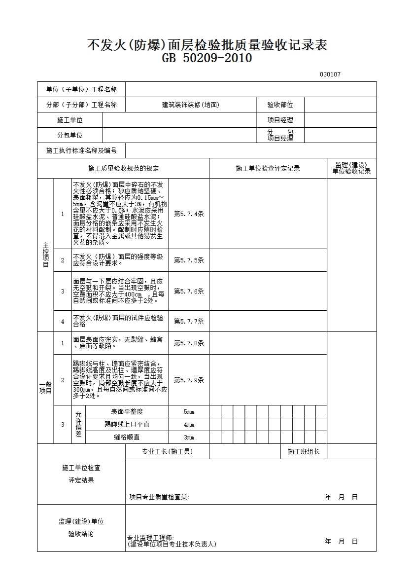 表格名称:不发火(防爆)面层检验批质量验收记录表