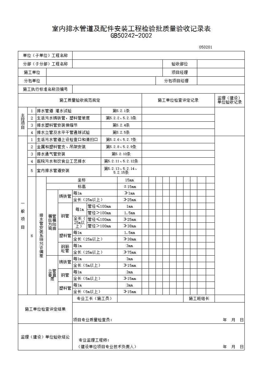 表格名称:室内排水管道及配件安装工程检验批质量验收记录