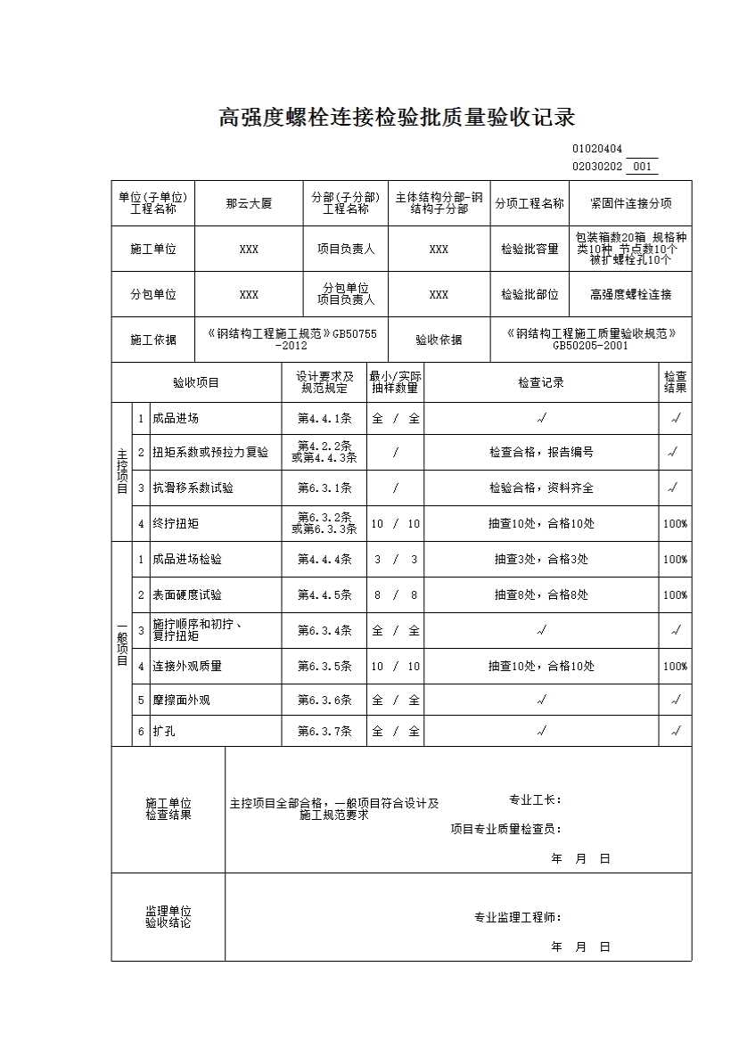 4.4.1 钢结构连接用高强度大六角头螺栓连接副、扭剪型高强度螺栓连接副、钢网架用高强度螺栓、普通螺栓、铆钉、自攻钉、拉铆钉、射钉、锚栓(机械型和化学试剂型)、地脚锚栓等紧固标准件及螺母、垫圈等标准配件,其品种、规格、性能等应符合现行国家产品标准和设计要求。高强度大六角头螺栓连接副和扭剪型高强度螺栓连接副出厂时应分别随箱带有扭矩系数和紧固轴力(预拉力)的检验报告。