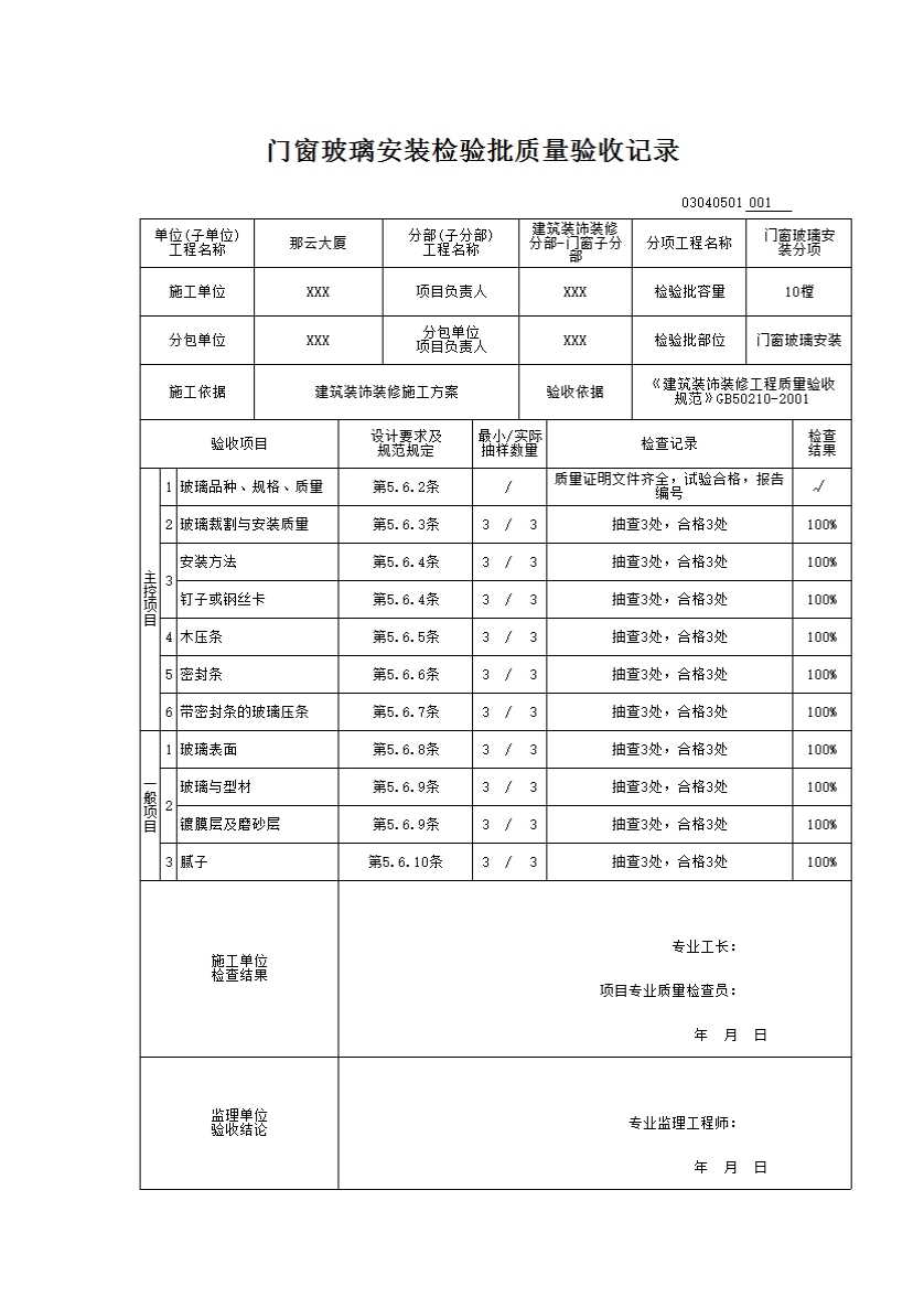 门窗玻璃每个检验批应抽查5%,并不得少于3樘,不足3樘时应全数检查;高层建筑外窗,每个检验批应至少抽查10%,并不得少于6樘,不足6樘时应全数检查。