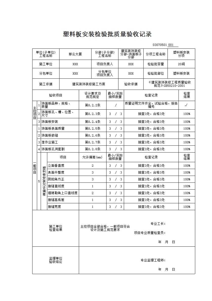 03070501_塑料板安装检验批质量验收记录