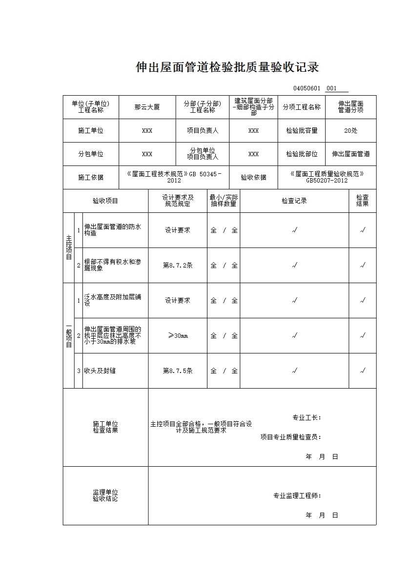 8.7.3 伸出屋面管道的泛水高度及附加层铺设,应符合设计要求。