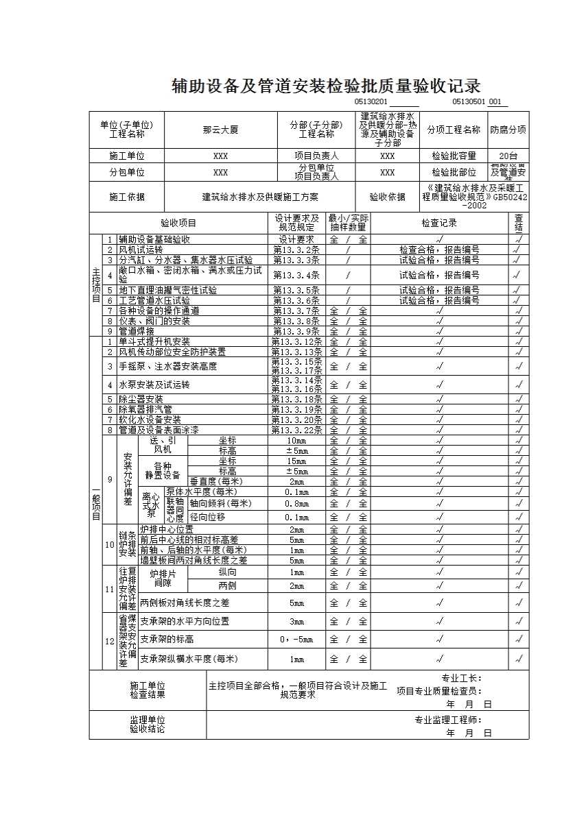 检验方法:在试验压力10min 内压力降不超过0.05MPa,然后降至工作压力进行检查,不渗不漏。