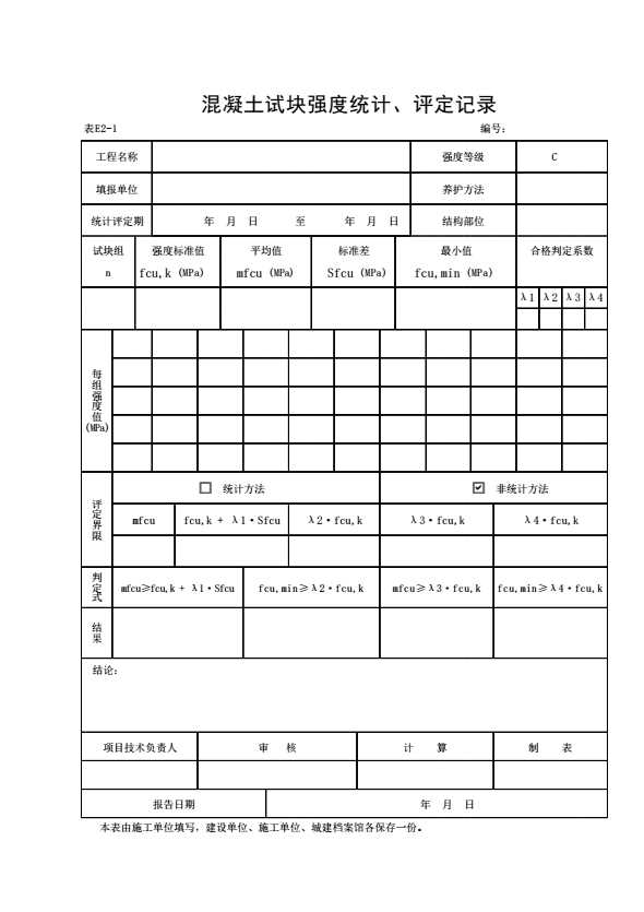 表格名称:表E2-1 混凝土试块强度统计、评定记录(非统计法)