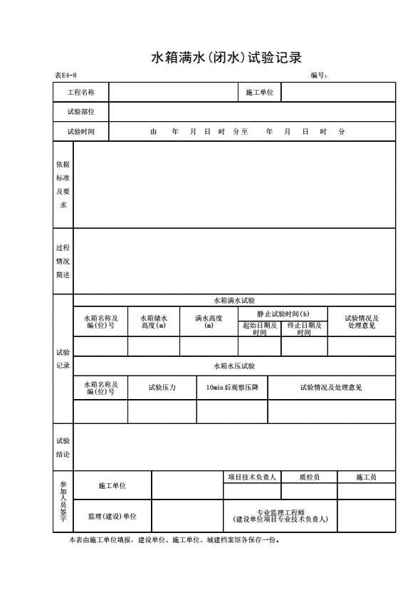 表格名称:表E4-8 水箱满水(闭水)试验记录