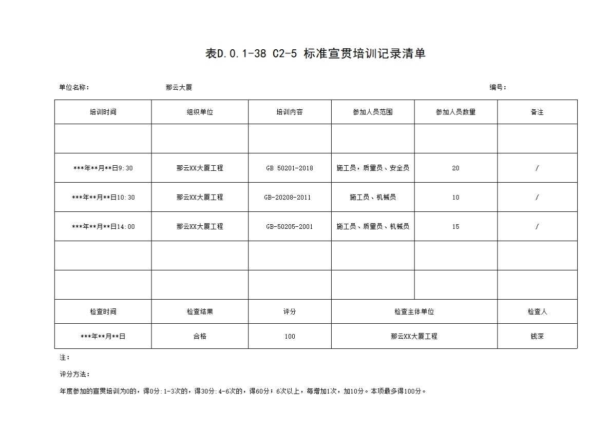 表格名称:表D.0.1-38 C2-5 标准宣贯培训记录清单