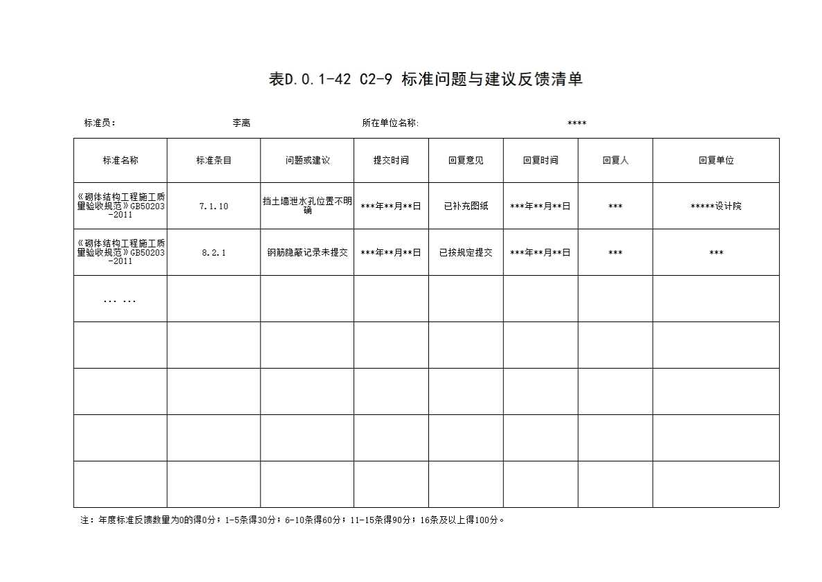 表格名称:表D.0.1-42 C2-9 标准问题与建议反馈清单