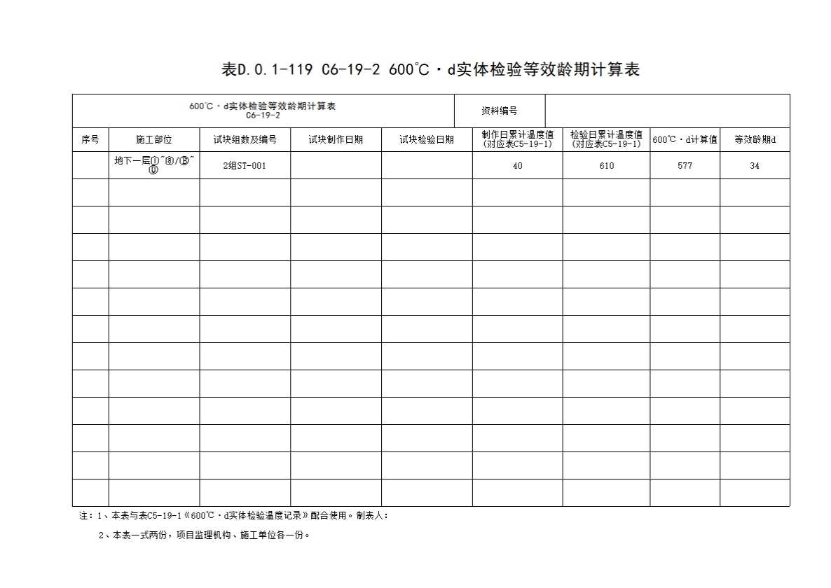 表格名称:表D.0.1-119 C6-19-2 600℃·d实体检验等效龄期计算表