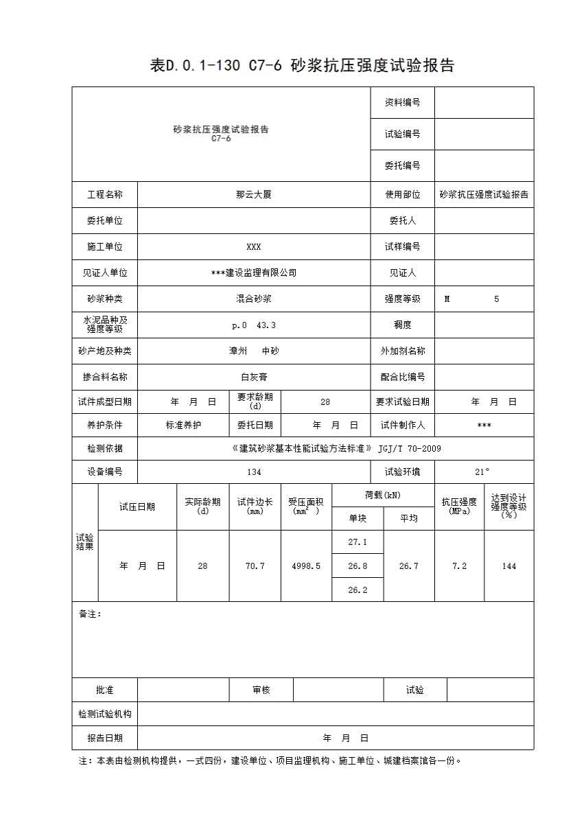 表格名称:表D.0.1-130 C7-6 砂浆抗压强度试验报告
