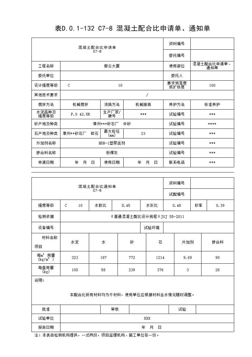 表D.0.1-132 C7-8 混凝土配合比申请单、通知单