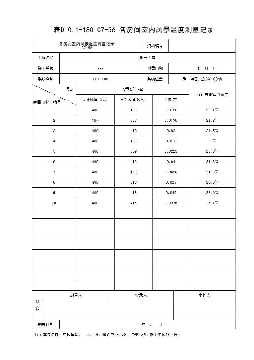 表格名称:表D.0.1-180 C7-56 各房间室内风景温度测量记录