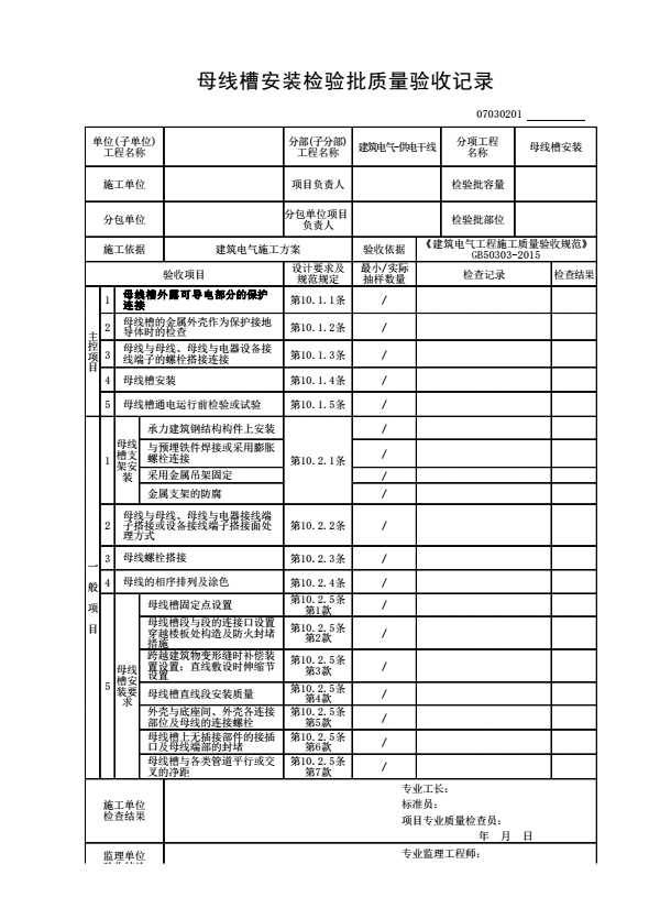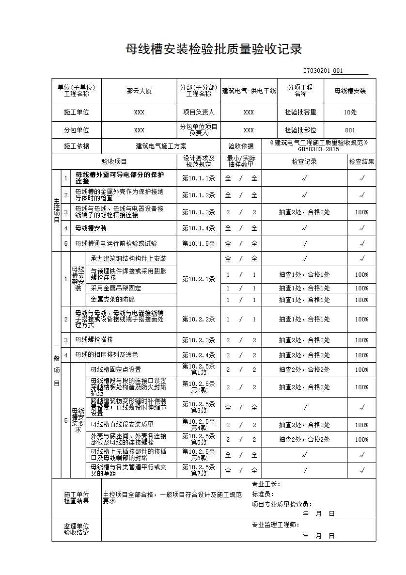 检查数量:第3款、第6款、第7款全数检查,其余按每个检验批的母线槽数量抽查20%,且各不得少于1处,并应覆盖不同的敷设形式。