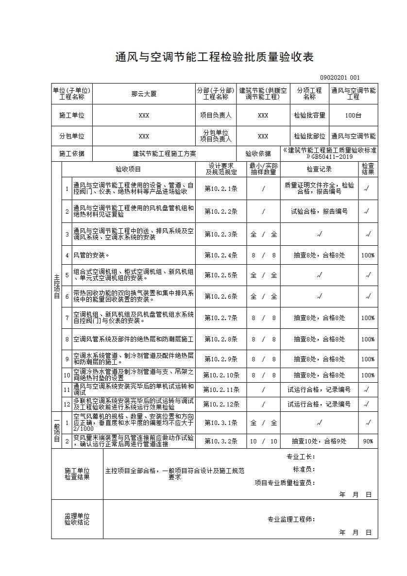 10.1.2 通风与空调节能工程施工中应及时进行质量检查,对隐蔽部位在隐蔽前进行验收,并应有详细的文字记录和必要的图像资料,施工完成后应进行通风与空调系统节能分项工程验收。