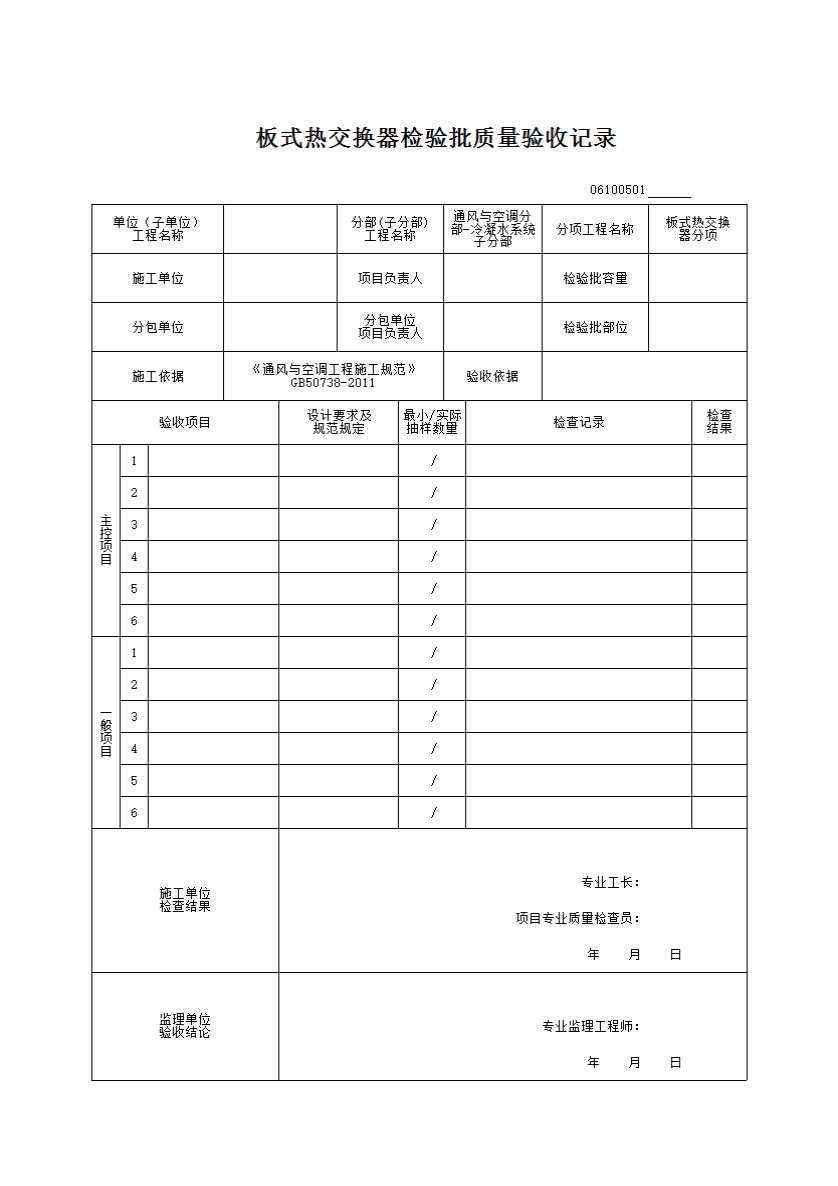 表格名称:06100501_板式热交换器检验批质量验收记录