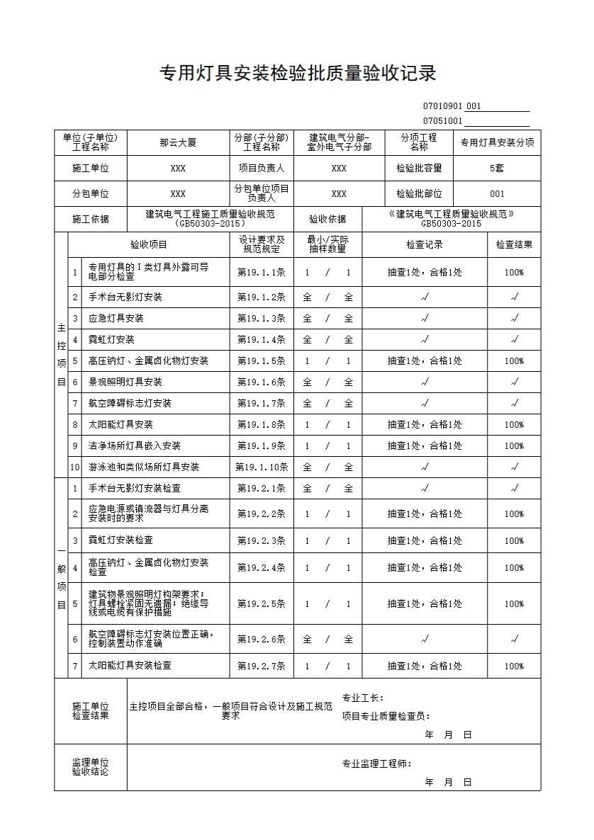 专用灯具安装检验批质量验收记录