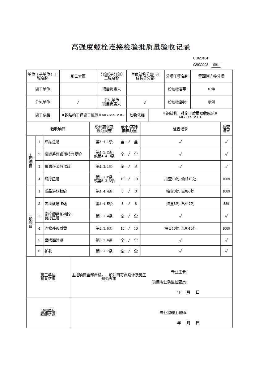 检查数量:按节点数抽查10%,但不应少于10节点,被抽查节点中梅花头未拧掉的扭剪型高强度螺栓连接副全数进行终拧扭矩检查。