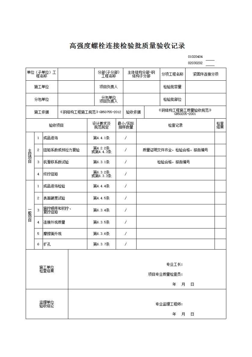 4.4.1 钢结构连接用高强度大六角头螺栓连接副、扭剪型高强度螺栓连接副、钢网架用高强度螺栓、普通螺栓、铆钉、自攻钉、拉铆钉、射钉、锚栓(机械型和化学试剂型)、地脚锚栓等紧固标准件及螺母、垫圈等标准配件,其品种、规格、性能等应符合现行国家产品标准和设计要求。高强度大六角头螺栓连接副和扭剪型高强度螺栓连接副出厂时应分别随箱带有扭矩系数和紧固轴力(预拉力)的检验报告。